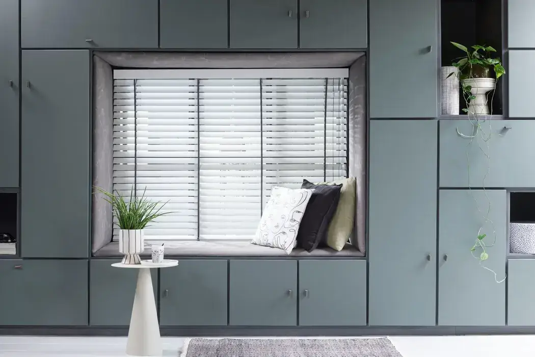Een complete transformatie door de plaatsing van stijlvolle houten jaloezieën: perfecte lichtregeling en privacy gecombineerd met een tijdloze uitstraling. De houten jaloezieën vormen een prachtig contrast met de donkere wand en creëren een serene, luxe sfeer...